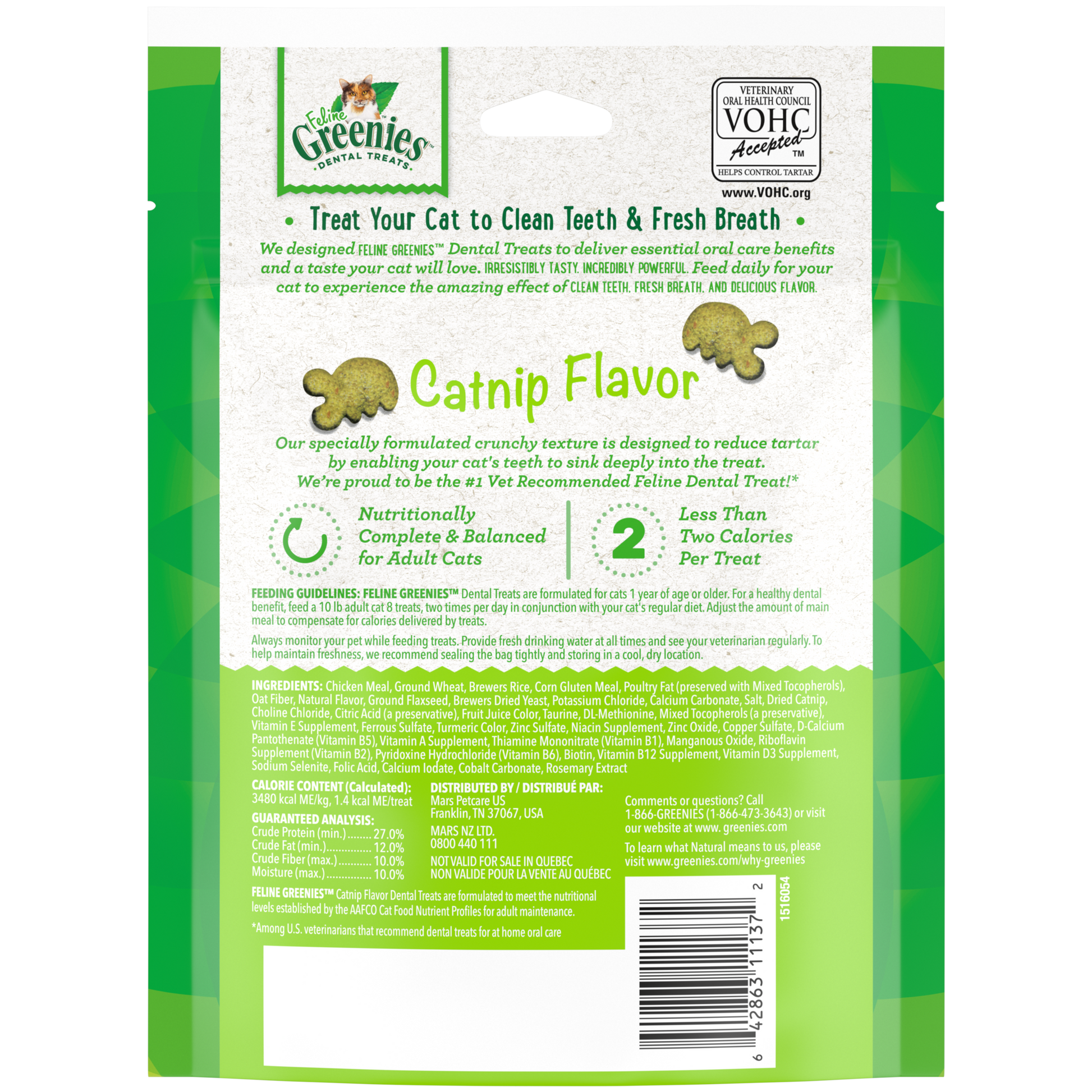 We designed FELINE GREENIES™ Dental Treats to deliver essential oral care benefits and a taste your cat will love. Irresistibly tasty, incredibly powerful. Our specially formulated crunchy texture is designed to reduce tartar buildup by enabling your cat's teeth to sink deeply into the treat. Feed daily for your cat to experience the amazing effect of CLEAN TEETH, FRESH BREATH, AND DELICIOUS FLAVOR.